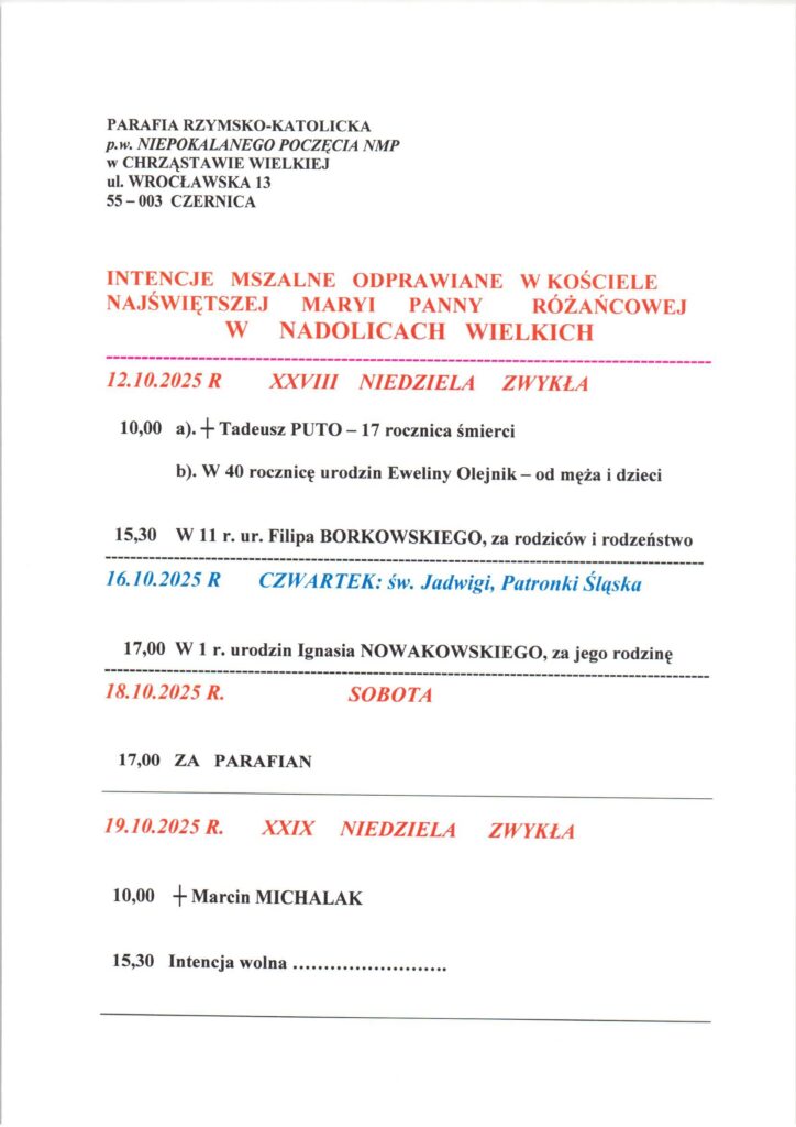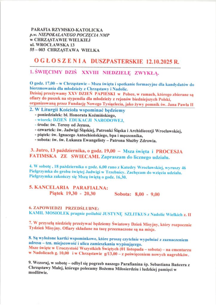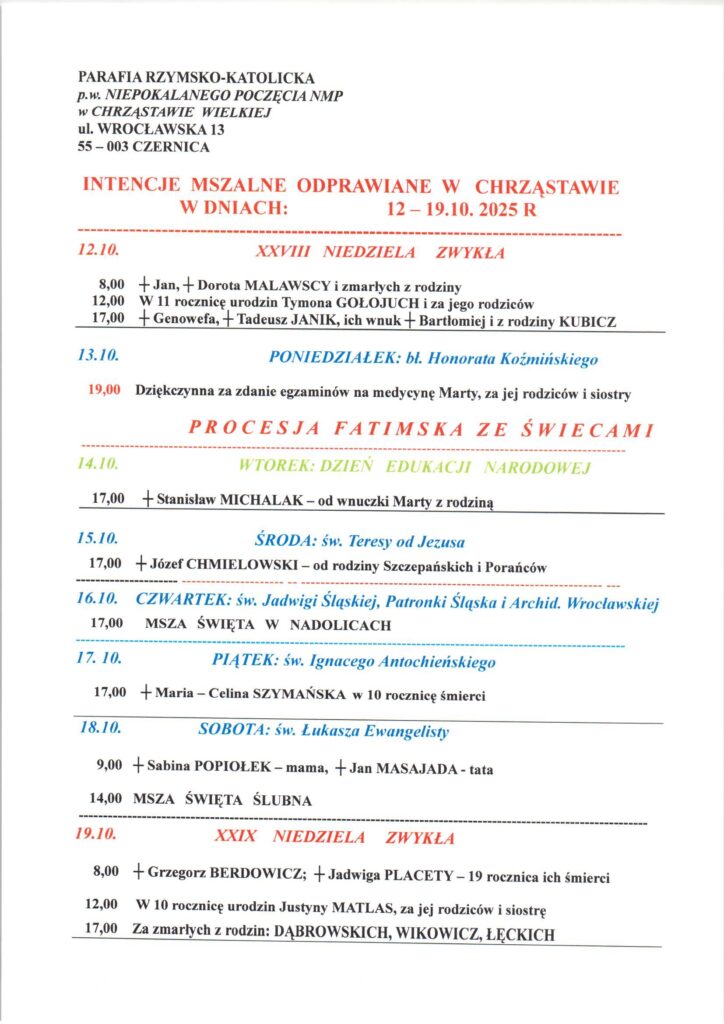 Niedziela 12.10.2025, Ogłoszenia duszpasterskie, intencje mszalne Posted on 11 października 2025 by sk