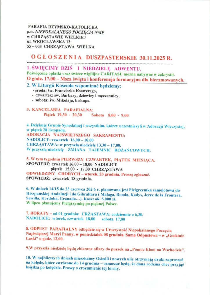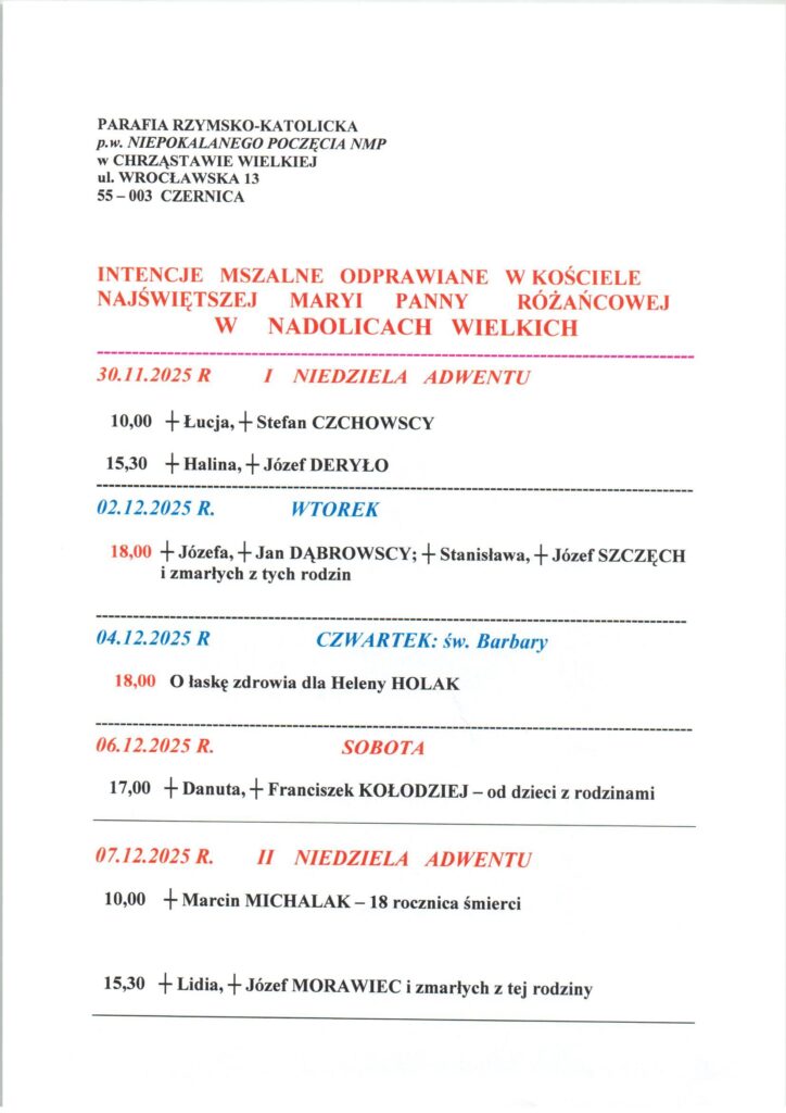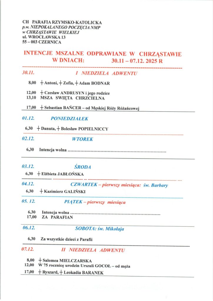 Niedziela 30.11.2025, Ogłoszenia duszpasterskie, intencje mszalne Posted on 30 listopada 20253 grudnia 2025 by sk