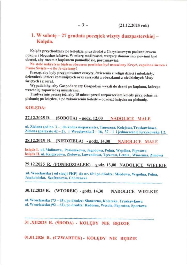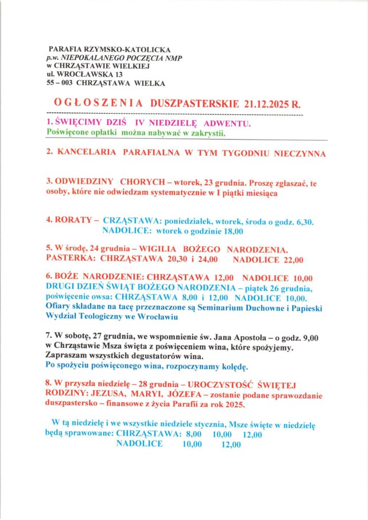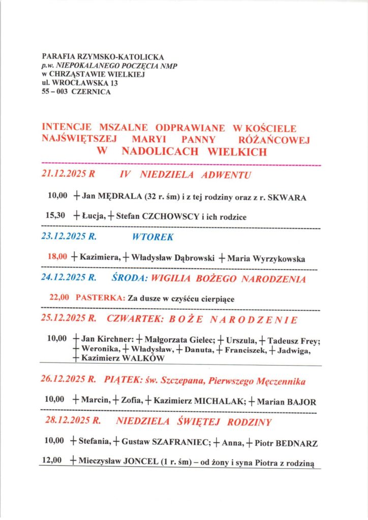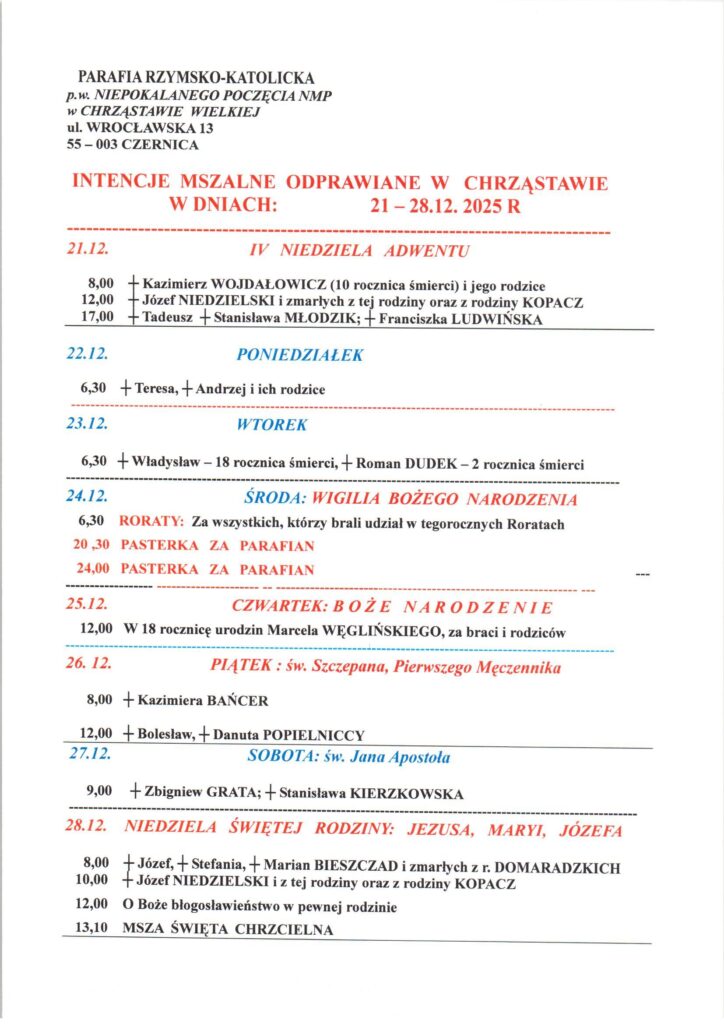 Niedziela 21.12.2025, Ogłoszenia duszpasterskie, intencje mszalne Posted on 21 grudnia 202523 grudnia 2025 by sk