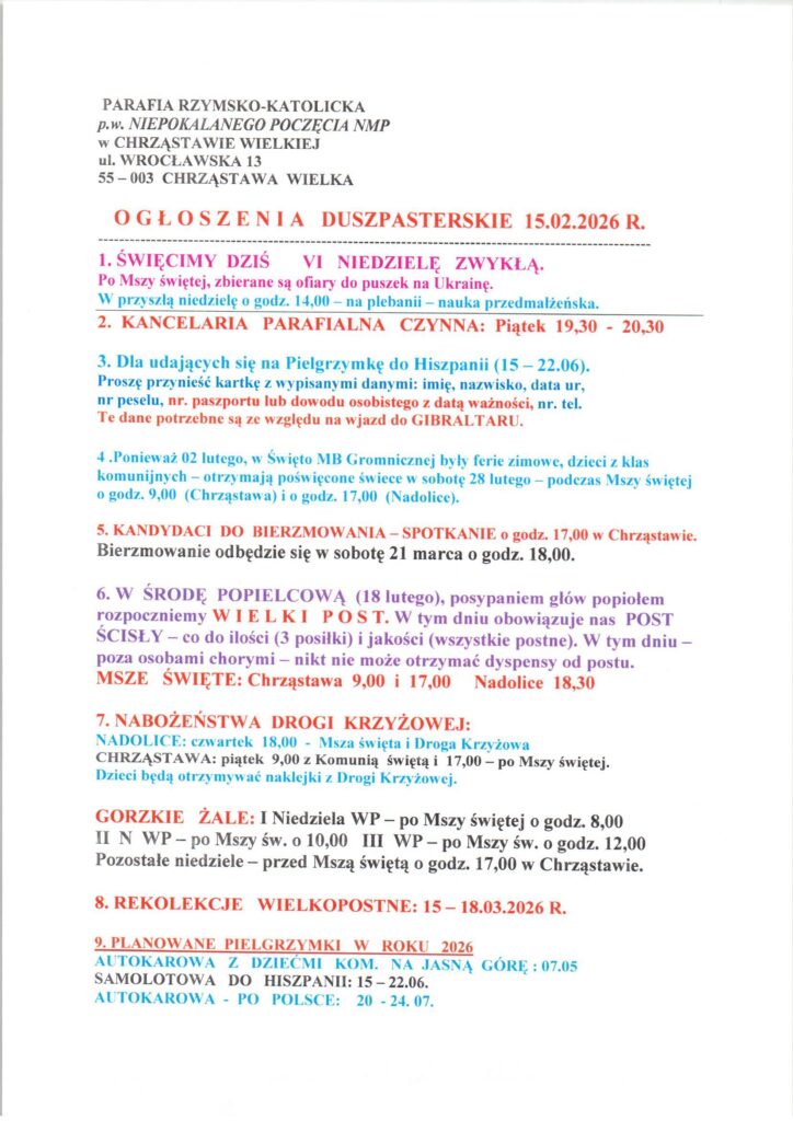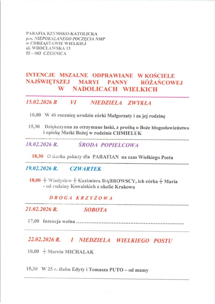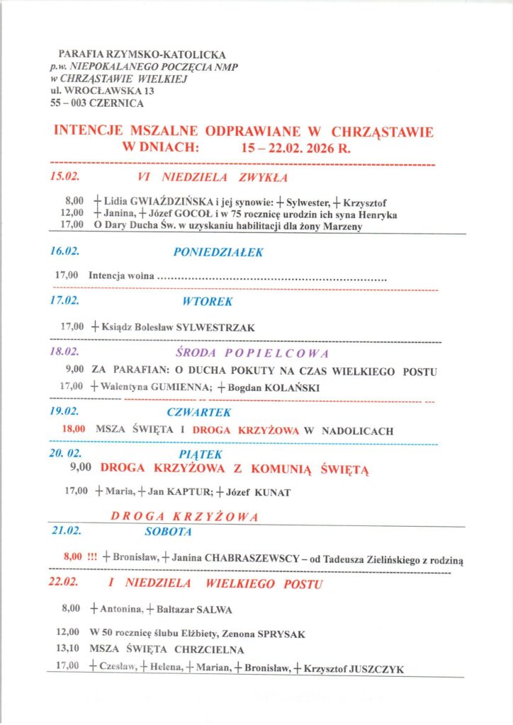 Niedziela 15.02.2026, Ogłoszenia duszpasterskie, intencje mszalne Posted on 15 lutego 20262 marca 2026 by sk