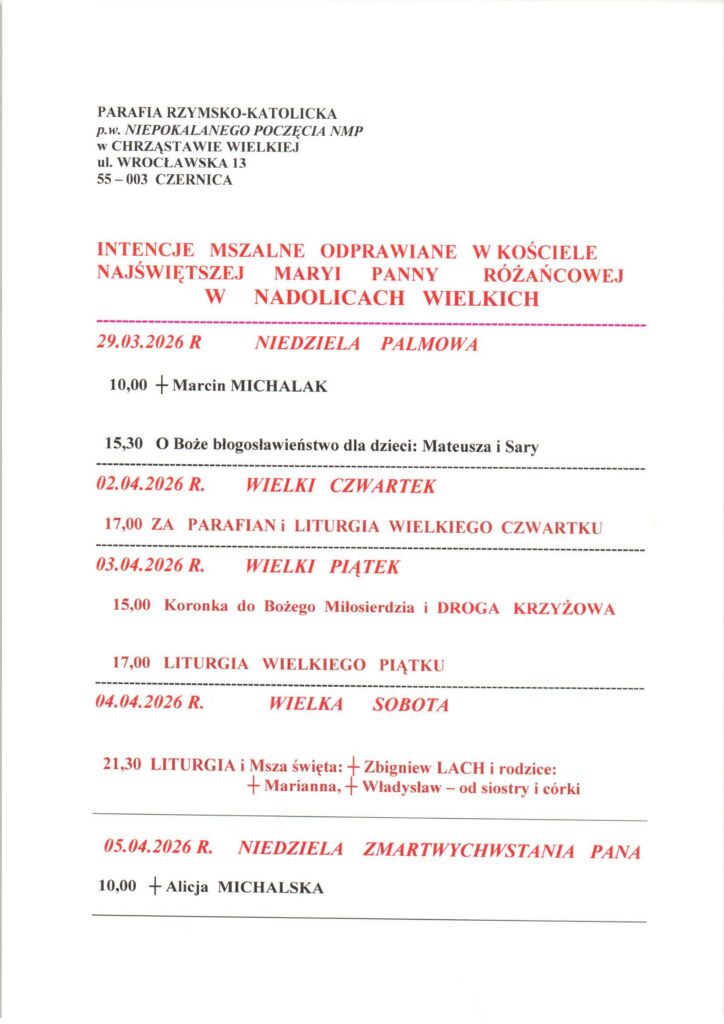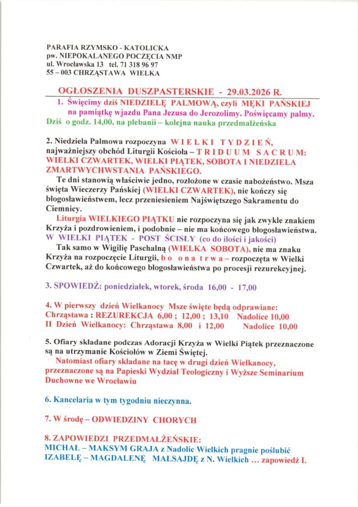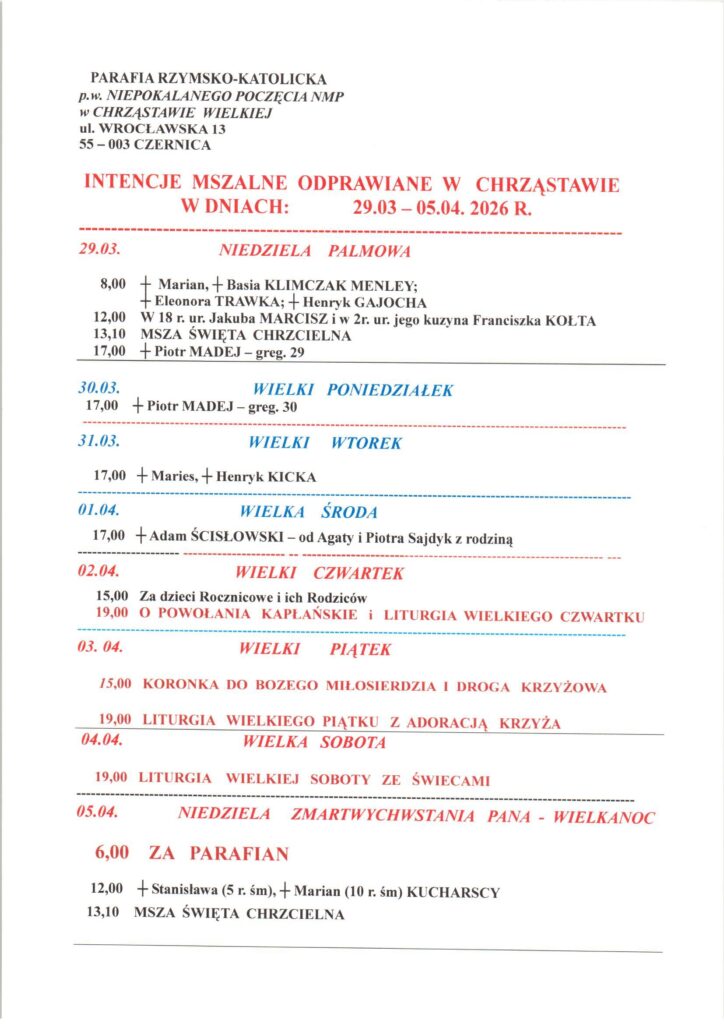 Niedziela 29.03.2026, Ogłoszenia duszpasterskie, intencje mszalne Posted on 29 marca 202631 marca 2026 by sk
